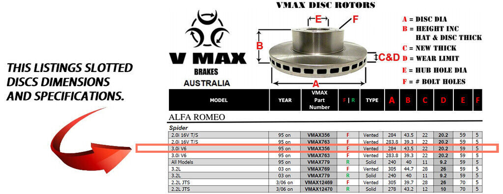 This sale is for a new pair (2 disc rotors) of Genuine VMAX Dimple Drilled & Slotted Performance Front disc brake rotors to suit ALFA ROMEO Spider 3.0i V6 models built 1995 Onwards and are a direct replacement item.