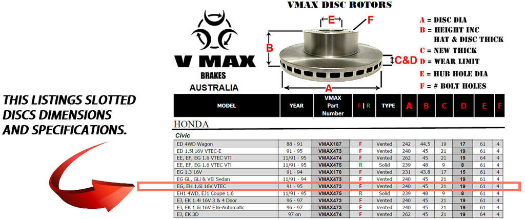 This sale is for a new pair (2 disc rotors) of Genuine VMAX Dimple Drilled & Slotted Performance Front disc brake rotors to suit HONDA Civic EG EH 1.6i 16V VTEC models built 1991 till 1995 and are a direct replacement item.