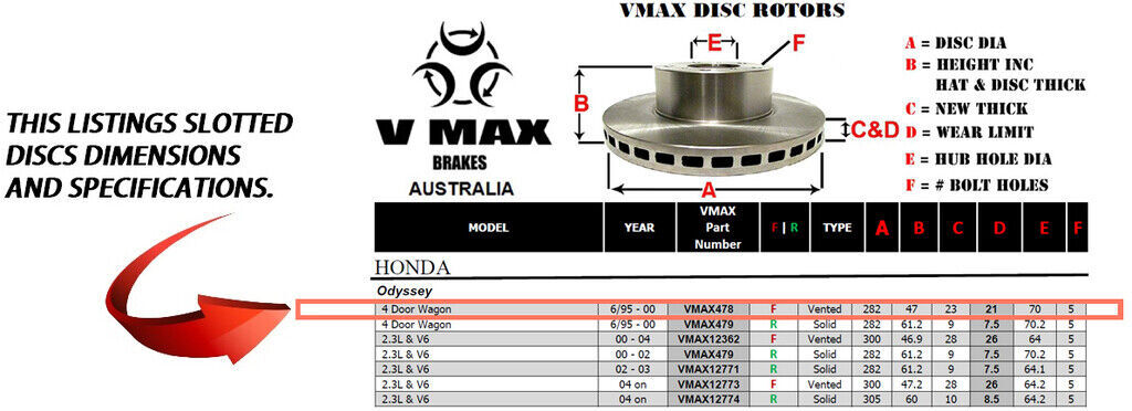 This sale is for a new pair (2 disc rotors) of Genuine VMAX Dimple Drilled & Slotted Performance Front disc brake rotors to suit HONDA Odyssey 4 Door Wagon models built 1995 till 2000 and are a direct replacement item.