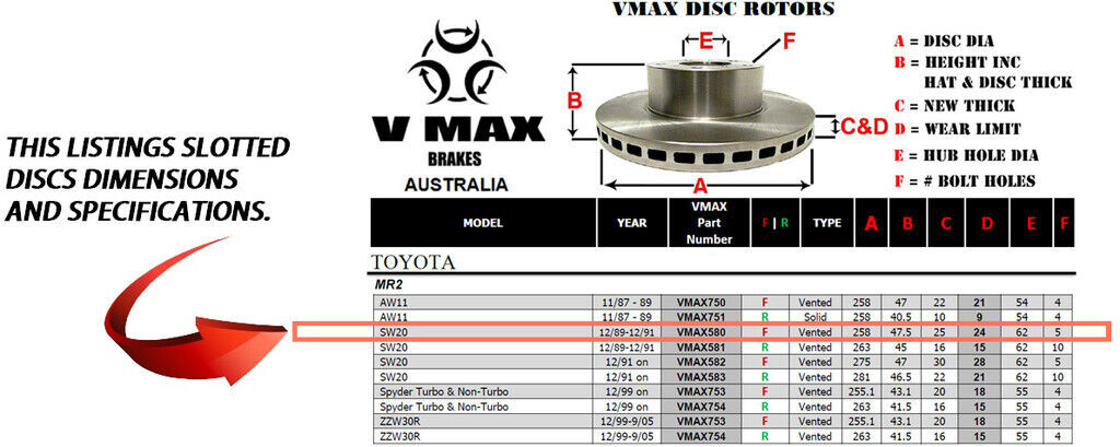 This sale is for a new pair (2 disc rotors) of Genuine VMAX Dimple Drilled & Slotted Performance Front disc brake rotors to suit TOYOTA MR2 SW20 models built 1989 till 1991 and are a direct replacement item.