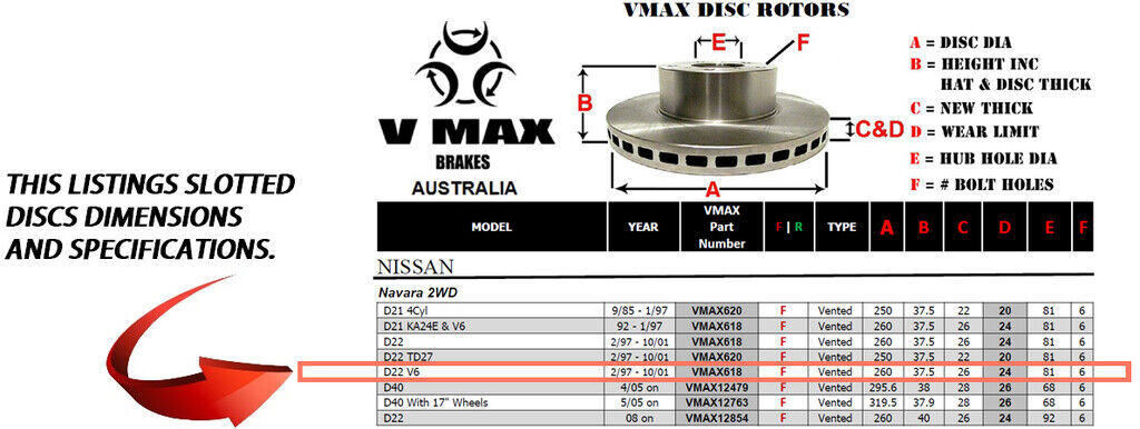 This sale is for a new pair (2 disc rotors) of Genuine VMAX Dimple Drilled & Slotted Performance Front disc brake rotors to suit NISSAN Navara 2WD D22 V6 models built 1997 till 2001 and are a direct replacement item.