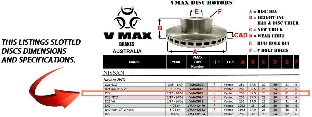This sale is for a new pair (2 disc rotors) of Genuine VMAX Dimple Drilled & Slotted Performance Front disc brake rotors to suit NISSAN Navara 2WD D22 models built 1997 till 2001 and are a direct replacement item.