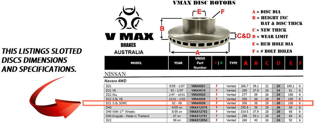 This sale is for a new pair (2 disc rotors) of Genuine VMAX Dimple Drilled & Slotted Performance Front disc brake rotors to suit NISSAN Navara 4WD D21 3.3L SOHC models built 2002 till 2006 and are a direct replacement item.