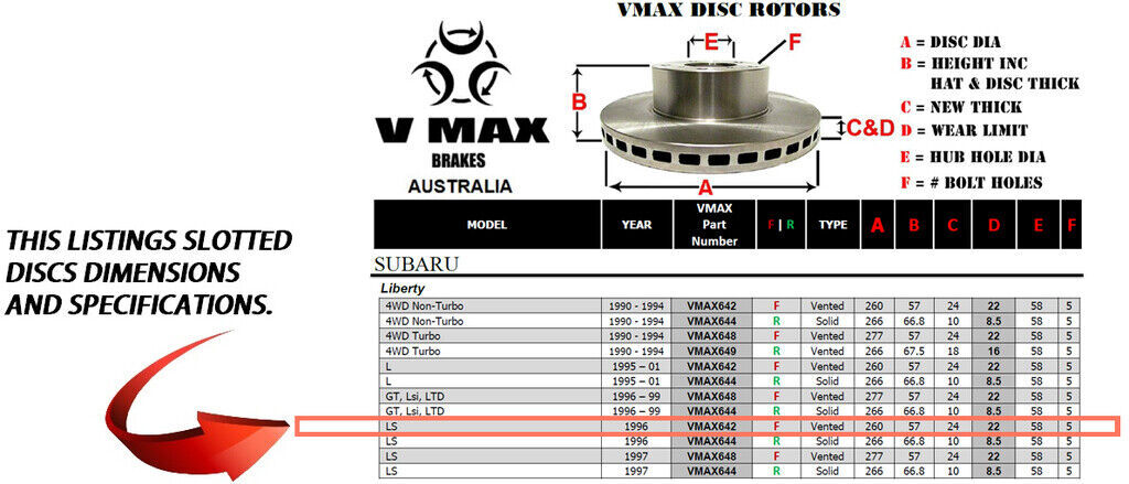 This sale is for a new pair (2 disc rotors) of Genuine VMAX Dimple Drilled & Slotted Performance Front disc brake rotors to suit SUBARU Liberty LS models built 1996 and are a direct replacement item.