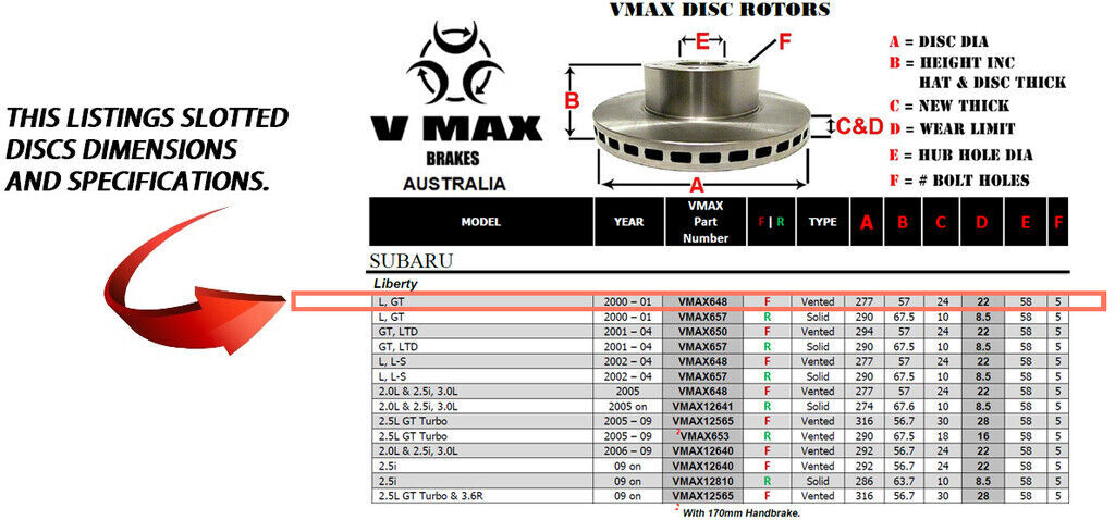 This sale is for a new pair (2 disc rotors) of Genuine VMAX Dimple Drilled & Slotted Performance Front disc brake rotors to suit SUBARU Liberty L GT models built 2000 till 2001 and are a direct replacement item.