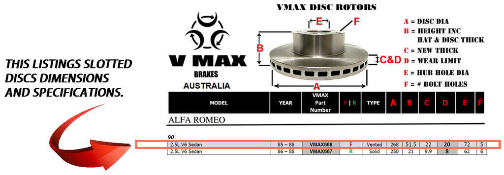 This sale is for a new pair (2 disc rotors) of Genuine VMAX Dimple Drilled & Slotted Performance Front disc brake rotors to suit ALFA ROMEO 90 2.5L V6 Sedan models built 1985 till 1988 and are a direct replacement item.