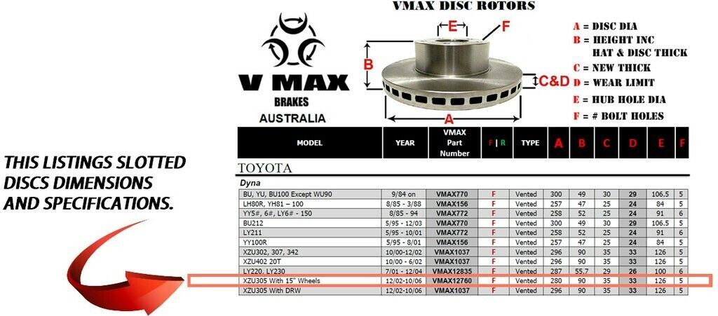 This sale is for a new pair (2 disc rotors) of Genuine VMAX Dimple Drilled & Slotted Performance Front disc brake rotors to suit TOYOTA Dyna XZU305 With 15" Wheels models built 2002 till 2006 and are a direct replacement item.