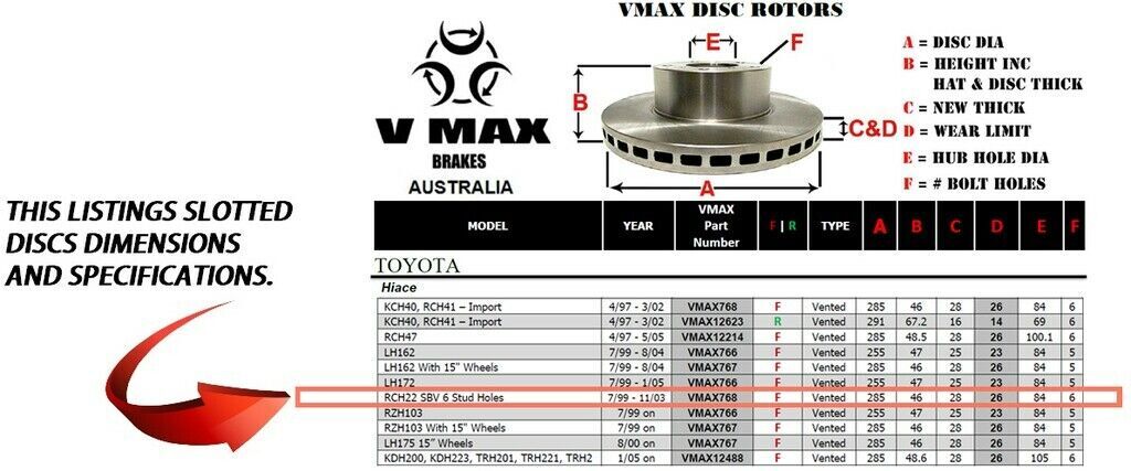 This sale is for a new pair (2 disc rotors) of Genuine VMAX Dimple Drilled & Slotted Performance Front disc brake rotors to suit TOYOTA Hiace RCH22 SBV 6 Stud Holes models built 1999 till 2003 and are a direct replacement item.