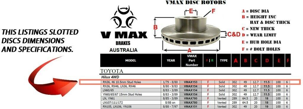 This sale is for a new pair (2 disc rotors) of Genuine VMAX Dimple Drilled & Slotted Performance Front disc brake rotors to suit TOYOTA Hilux 4WD RN36 46 10.5mm Stud Holes models built 1979 till 1980 and are a direct replacement item.