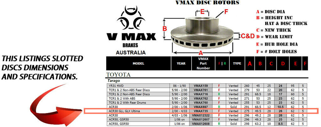 This sale is for a new pair (2 disc rotors) of Genuine VMAX Dimple Drilled & Slotted Performance Front disc brake rotors and a matching Front set of brake pads to suit TOYOTA Tarago ACR30 GLi GLX Ultima models built 2000 till 2003 and are a direct replacement item.