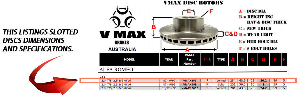 This sale is for a new pair (2 disc rotors) of Genuine VMAX Dimple Drilled & Slotted Performance Front disc brake rotors and a matching Front set of brake pads to suit ALFA ROMEO 164 2.0i T S 2.5i 3.0i V6 models built 1987 till 1992 and are a direct replacement item.