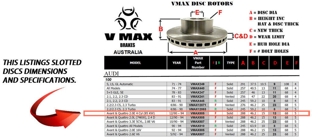 This sale is for a new pair (2 disc rotors) of Genuine VMAX Dimple Drilled & Slotted Performance Front disc brake rotors and a matching Front set of brake pads to suit AUDI 100 Avant Quattro 2.0E 4 Cyl 85 KW models built 1990 till 1994 and are a direct replacement item.