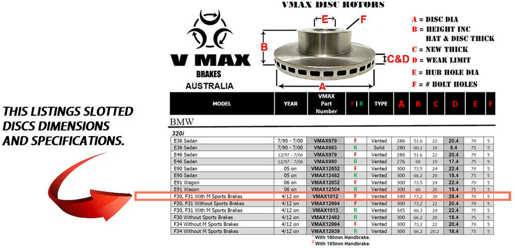 This sale is for a new pair (2 disc rotors) of Genuine VMAX Dimple Drilled & Slotted Performance Front disc brake rotors and a matching Front set of brake pads to suit BMW 320i F30 F31 With M Sports Brakes models built 2012 Onwards and are a direct replacement item.