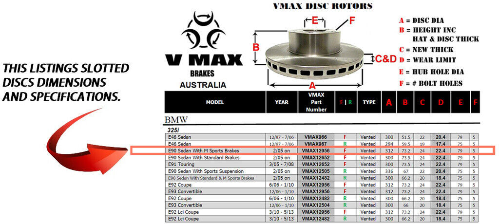 This sale is for a new pair (2 disc rotors) of Genuine VMAX Dimple Drilled & Slotted Performance Front disc brake rotors and a matching Front set of brake pads to suit BMW 325i E90 Sedan With M Sports Brakes models built 2005 Onwards and are a direct replacement item.