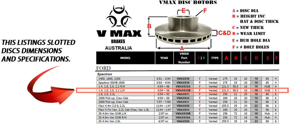 This sale is for a new pair (2 disc rotors) of Genuine VMAX Dimple Drilled & Slotted Performance Front disc brake rotors and a matching Front set of brake pads to suit FORD Spectron 1.4 1.8 2.0 2.2 models built 1984 till 1996 and are a direct replacement item.