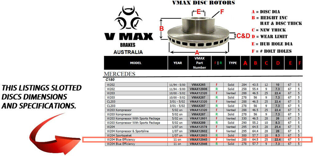 This sale is for a new pair (2 disc rotors) of Genuine VMAX Dimple Drilled & Slotted Performance Front disc brake rotors and a matching Front set of brake pads to suit MERCEDES C180 W204 Blue Efficiency models built 2011 Onwards and are a direct replacement item.