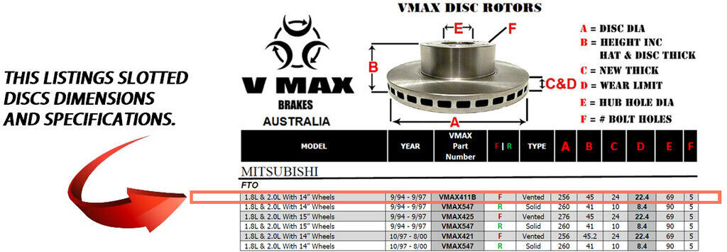 This sale is for a new pair (2 disc rotors) of Genuine VMAX Dimple Drilled & Slotted Performance Front disc brake rotors and a matching Front set of brake pads to suit MITSUBISHI FTO 1.8L 2.0L With 14" Wheels models built 1994 till 1997 and are a direct replacement item.