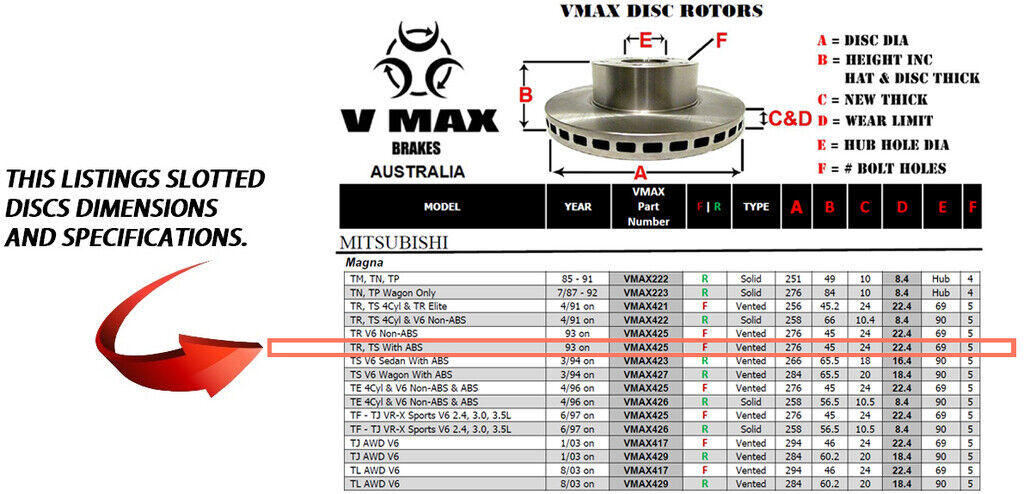 This sale is for a new pair (2 disc rotors) of Genuine VMAX Dimple Drilled & Slotted Performance Front disc brake rotors and a matching Front set of brake pads to suit MITSUBISHI Magna TR TS With ABS models built 1993 Onwards and are a direct replacement item.