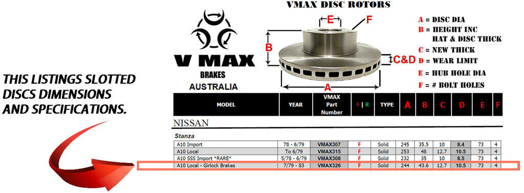 This sale is for a new pair (2 disc rotors) of Genuine VMAX Dimple Drilled & Slotted Performance Front disc brake rotors and a matching Front set of brake pads to suit NISSAN Stanza A10 Local Girlock Brake models built 1979 till 1983 and are a direct replacement item.