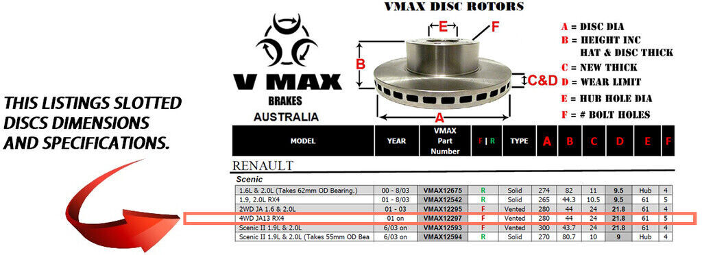 This sale is for a new pair (2 disc rotors) of Genuine VMAX Dimple Drilled & Slotted Performance Front disc brake rotors and a matching Front set of brake pads to suit RENAULT Scenic 4WD JA13 RX4 models built 2001 Onwards and are a direct replacement item.