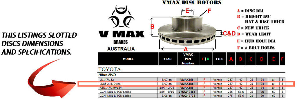 This sale is for a new pair (2 disc rotors) of Genuine VMAX Dimple Drilled & Slotted Performance Front disc brake rotors and a matching Front set of brake pads to suit TOYOTA Hilux 2WD LN85 2.4L Diesel models built 1997 Onwards and are a direct replacement item.