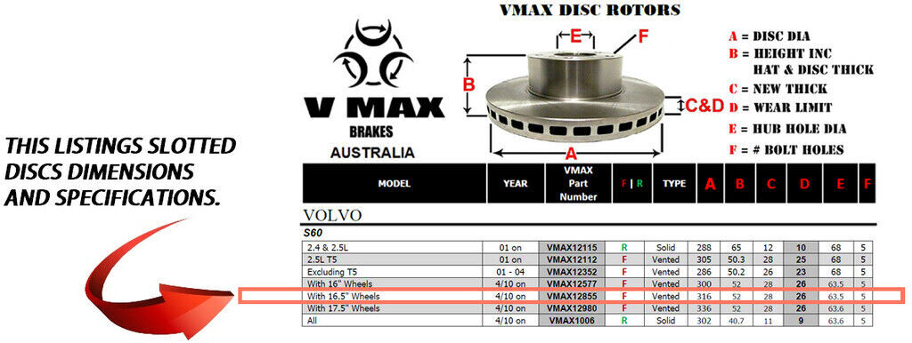 This sale is for a new pair (2 disc rotors) of Genuine VMAX Dimple Drilled & Slotted Performance Front disc brake rotors and a matching Front set of brake pads to suit VOLVO S60 With 16.5" Wheels models built 2010 Onwards and are a direct replacement item.
