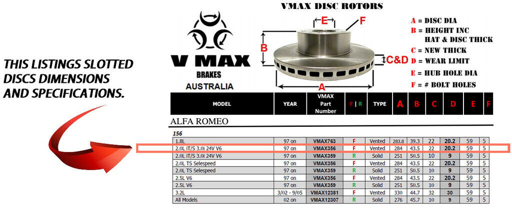 This sale is for a new pair (2 disc rotors) of Genuine VMAX Dimple Drilled & Slotted Performance Front disc brake rotors to suit ALFA ROMEO 156 2.0L iT S 3.0i 24V V6 models built 1997 Onwards and are a direct replacement item.