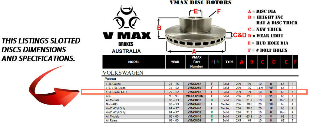 This sale is for a new pair (2 disc rotors) of Genuine VMAX Dimple Drilled & Slotted Performance Front disc brake rotors to suit VOLKSWAGEN Passat 1.5L Diesel GLD models built 1979 till 1982 and are a direct replacement item.