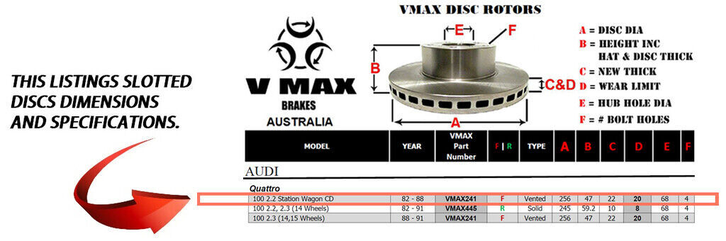 This sale is for a new pair (2 disc rotors) of Genuine VMAX Dimple Drilled & Slotted Performance Front disc brake rotors to suit AUDI Quattro 100 2.2 Station Wagon CD models built 1982 till 1988 and are a direct replacement item.