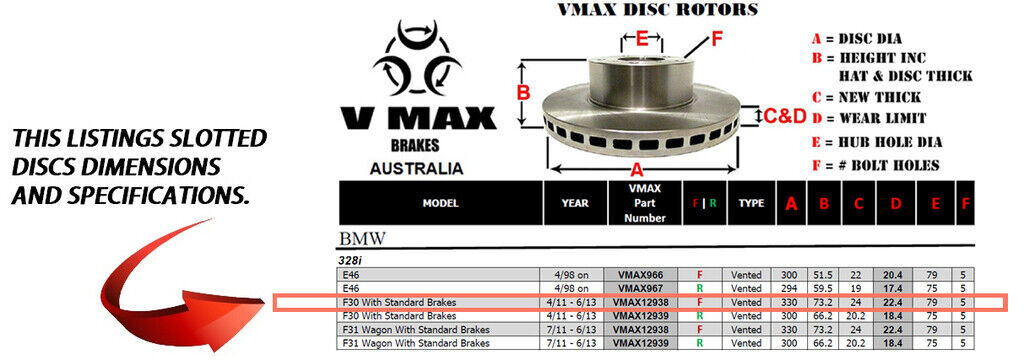 This sale is for a new pair (2 disc rotors) of Genuine VMAX Dimple Drilled & Slotted Performance Front disc brake rotors to suit BMW 328i F30 With Standard Brakes models built 2011 till 2013 and are a direct replacement item.