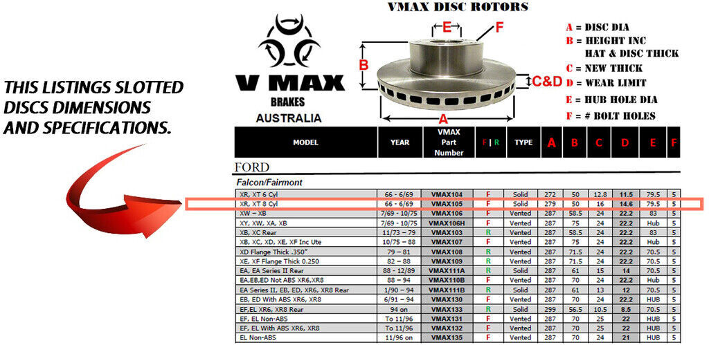 This sale is for a new pair (2 disc rotors) of Genuine VMAX Dimple Drilled & Slotted Performance Front disc brake rotors to suit FORD Falcon & Fairmont XR XT 8 Cyl models built 1966 till 1969 and are a direct replacement item.