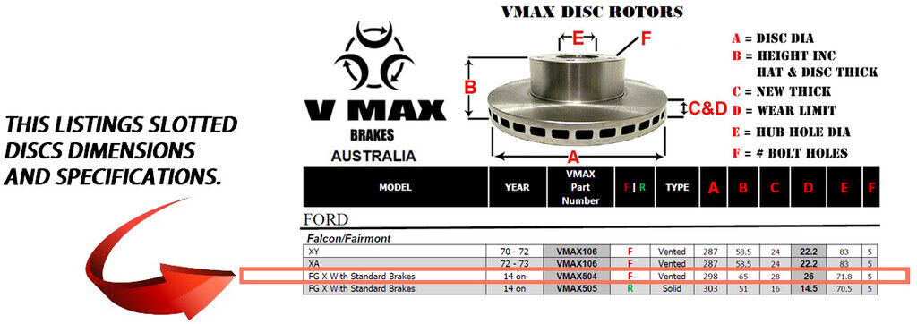 This sale is for a new pair (2 disc rotors) of Genuine VMAX Dimple Drilled & Slotted Performance Front disc brake rotors to suit FORD Falcon & Fairmount FGX With Std Brakes models built 2014 Onwards and are a direct replacement item.