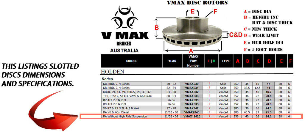 This sale is for a new pair (2 disc rotors) of Genuine VMAX Dimple Drilled & Slotted Performance Front disc brake rotors to suit HOLDEN Rodeo RA Without High Ride Suspension models built 2002 till 2008 and are a direct replacement item.