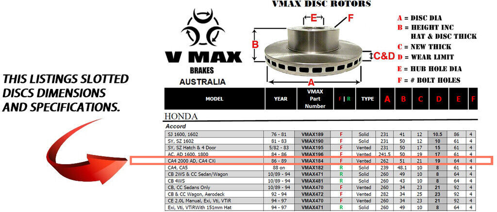 This sale is for a new pair (2 disc rotors) of Genuine VMAX Dimple Drilled & Slotted Performance Front disc brake rotors to suit HONDA Accord CA4 2000 AD CA4 Cxi models built 1986 till 1989 and are a direct replacement item.