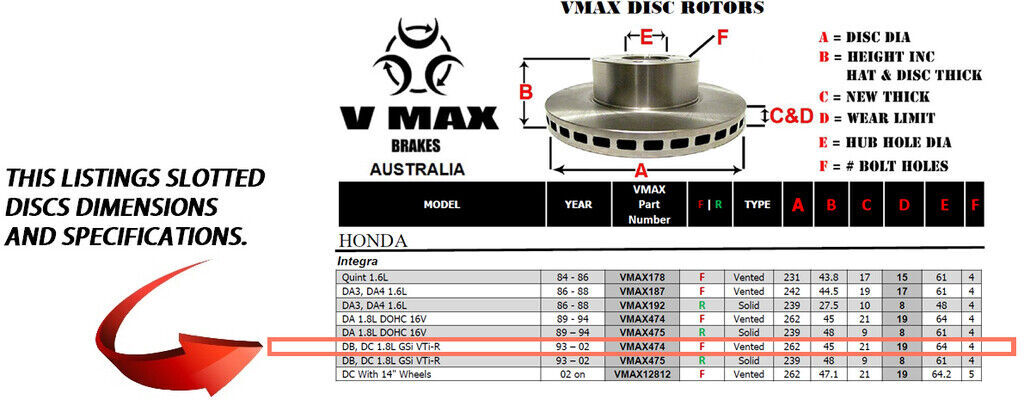 This sale is for a new pair (2 disc rotors) of Genuine VMAX Dimple Drilled & Slotted Performance Front disc brake rotors to suit HONDA Integra DB DC 1.8L GSi VTi-R models built 1993 till 2002 and are a direct replacement item.