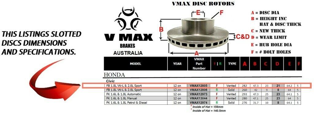 This sale is for a new pair (2 disc rotors) of Genuine VMAX Dimple Drilled & Slotted Performance Front disc brake rotors to suit HONDA Civic FB 1.8L Vti-L 2.0L Sport models built 2012 Onwards and are a direct replacement item.