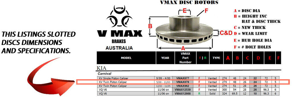 This sale is for a new pair (2 disc rotors) of Genuine VMAX Dimple Drilled & Slotted Performance Front disc brake rotors to suit KIA Carnival KV Twin Piston Caliper models built 1900 till 2003 and are a direct replacement item.