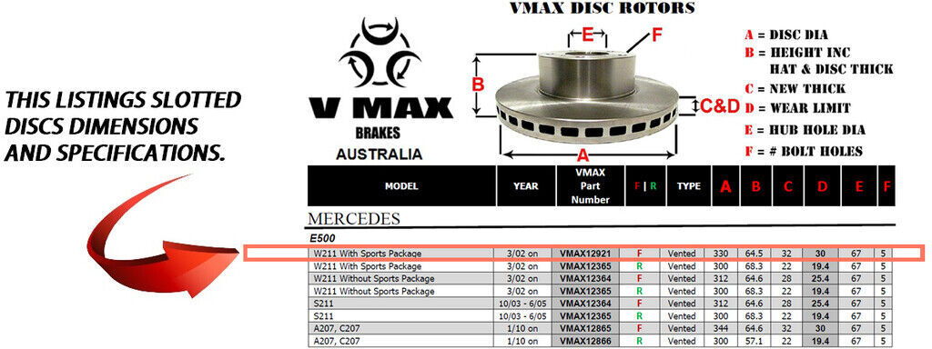 This sale is for a new pair (2 disc rotors) of Genuine VMAX Dimple Drilled & Slotted Performance Front disc brake rotors to suit MERCEDES E500 W211 With Sports Package models built 2002 Onwards and are a direct replacement item.