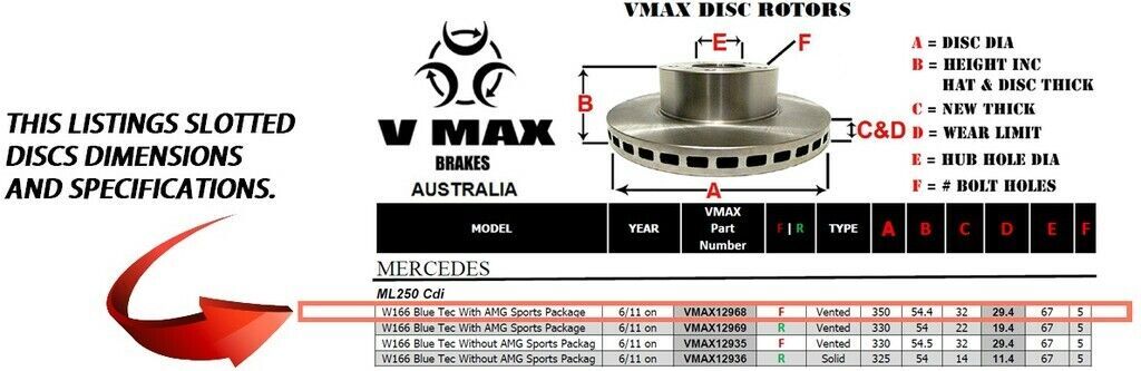 This sale is for a new pair (2 disc rotors) of Genuine VMAX Dimple Drilled & Slotted Performance Front disc brake rotors to suit MERCEDES ML250 Cdi W166 BlueTec With AMG Sprt models built 2011 Onwards and are a direct replacement item.