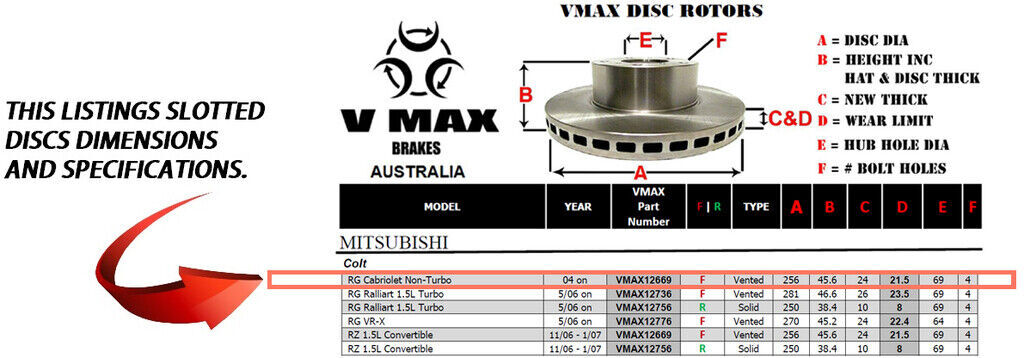 This sale is for a new pair (2 disc rotors) of Genuine VMAX Dimple Drilled & Slotted Performance Front disc brake rotors to suit MITSUBISHI Colt RG Cabriolet Non-Turbo models built 2004 Onwards and are a direct replacement item.