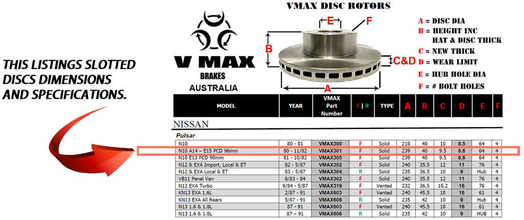 This sale is for a new pair (2 disc rotors) of Genuine VMAX Dimple Drilled & Slotted Performance Front disc brake rotors to suit NISSAN Pulsar N10 A14 E15 PCD 96mm models built 1980 till 1982 and are a direct replacement item.