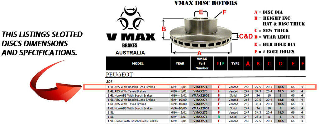 This sale is for a new pair (2 disc rotors) of Genuine VMAX Dimple Drilled & Slotted Performance Front disc brake rotors to suit PEUGEOT 306 1.4L ABS With Bosch/Lucas Brakes models built 1994 till 2001 and are a direct replacement item.