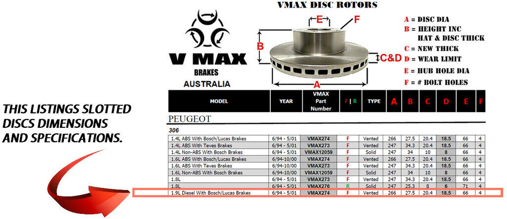 This sale is for a new pair (2 disc rotors) of Genuine VMAX Dimple Drilled & Slotted Performance Front disc brake rotors to suit PEUGEOT 306 1.9L Disl With Bosch/Lucas Brakes models built 1994 till 2001 and are a direct replacement item.