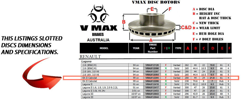 This sale is for a new pair (2 disc rotors) of Genuine VMAX Dimple Drilled & Slotted Performance Front disc brake rotors to suit RENAULT Laguna EA II Cabrolet models built 1999 Onwards and are a direct replacement item.