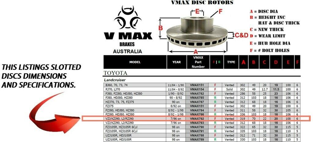This sale is for a new pair (2 disc rotors) of Genuine VMAX Dimple Drilled & Slotted Performance Front disc brake rotors to suit TOYOTA Landcruiser VZJ/KZJ90 LJ/RZJ90 models built 1996 Onwards and are a direct replacement item.