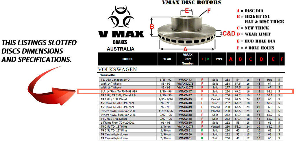 This sale is for a new pair (2 disc rotors) of Genuine VMAX Dimple Drilled & Slotted Performance Front disc brake rotors to suit VOLKSWAGEN Caravelle 1LA 14" Rim To 70T99 999 models built 1990 till 1996 and are a direct replacement item.