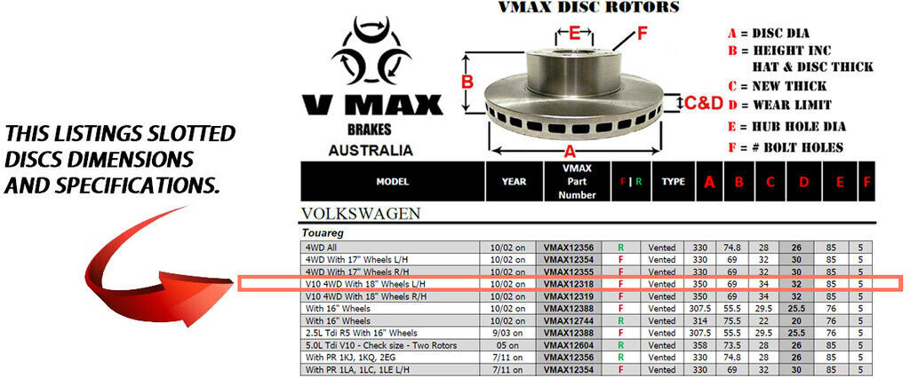 This sale is for a new pair (2 disc rotors) of Genuine VMAX Dimple Drilled & Slotted Performance Front disc brake rotors to suit VOLKSWAGEN Touareg V10 4WD With 18"Wheels models built 2002 Onwards and are a direct replacement item.
