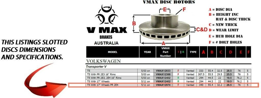 This sale is for a new pair (2 disc rotors) of Genuine VMAX Dimple Drilled & Slotted Performance Front disc brake rotors to suit VOLKSWAGEN Transporter V T5 17" Wheels PR 2E4 models built 2011 Onwards and are a direct replacement item.