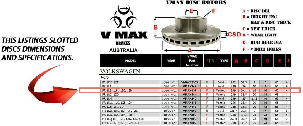 This sale is for a new pair (2 disc rotors) of Genuine VMAX Dimple Drilled & Slotted Performance Front disc brake rotors to suit VOLKSWAGEN Polo PR 1LB 1LM 1ZC 1ZN models built 1994 till 2001 and are a direct replacement item.