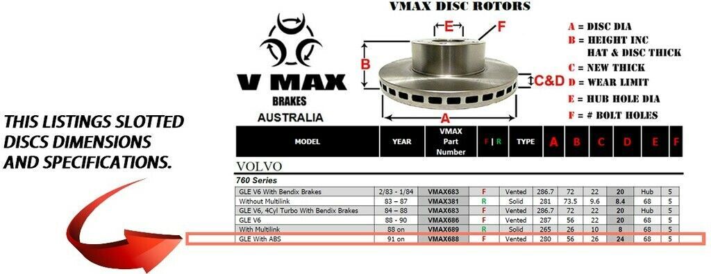 This sale is for a new pair (2 disc rotors) of Genuine VMAX Dimple Drilled & Slotted Performance Front disc brake rotors to suit VOLVO 760 Series GLE With ABS models built 1991 Onwards and are a direct replacement item.